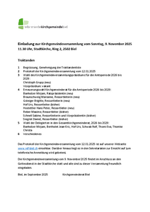 Einladung zur Kirchgemeindeversammlung vom Sonntag, 9. November 2025 11.30 Uhr, Stadtkirche, Ring 2, 2502 Biel Traktanden 1 2 3 4 5 6 Begrüssung, Genehmigung…